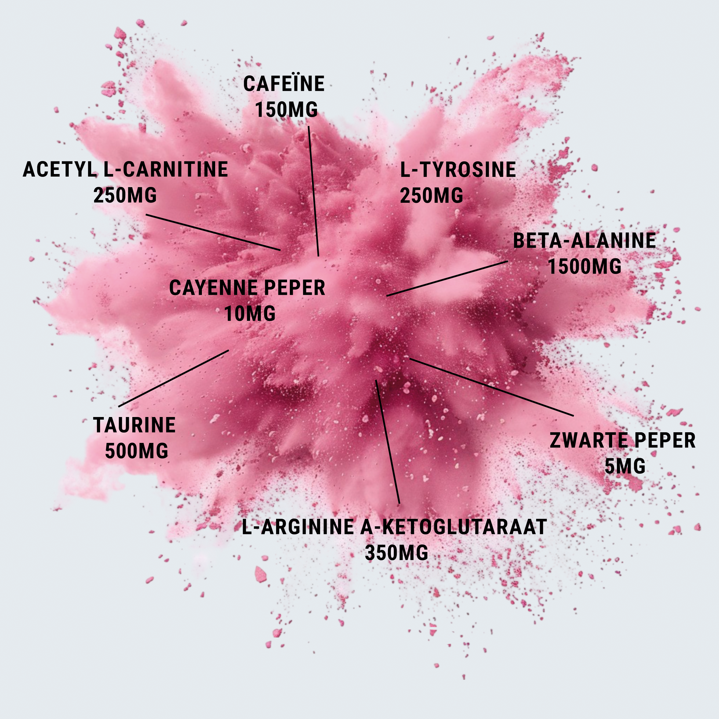 Berry Blast/Energy Drink/Lemon Grape/Passion Fruit/Tropical Fruits: Beta Alanine, Taurine, Citrulline Malate, L-Arginine Alpha-Ketoglutarate, L-Tyrosine, Acetyl L-Carnitine, Cafeïne, Cayennepeper, Zwarte peper, Vitamine C en Pyridoxine, Maltodextrine, Cellulose, Flavor, Food Colorant: Red Cabbage, Citric Acid, Salt, Sweeteners: Sucralose, Acesulfame K.